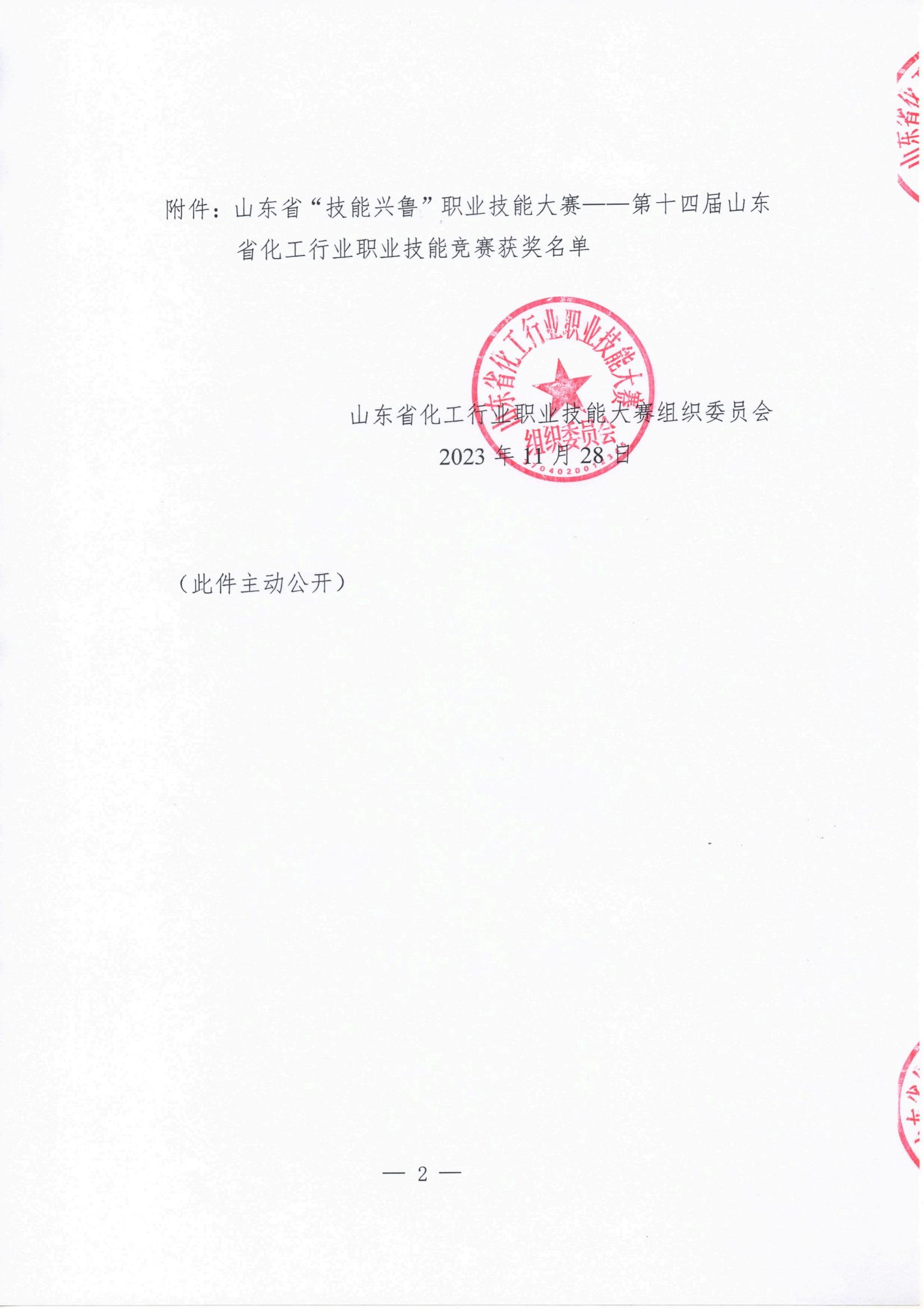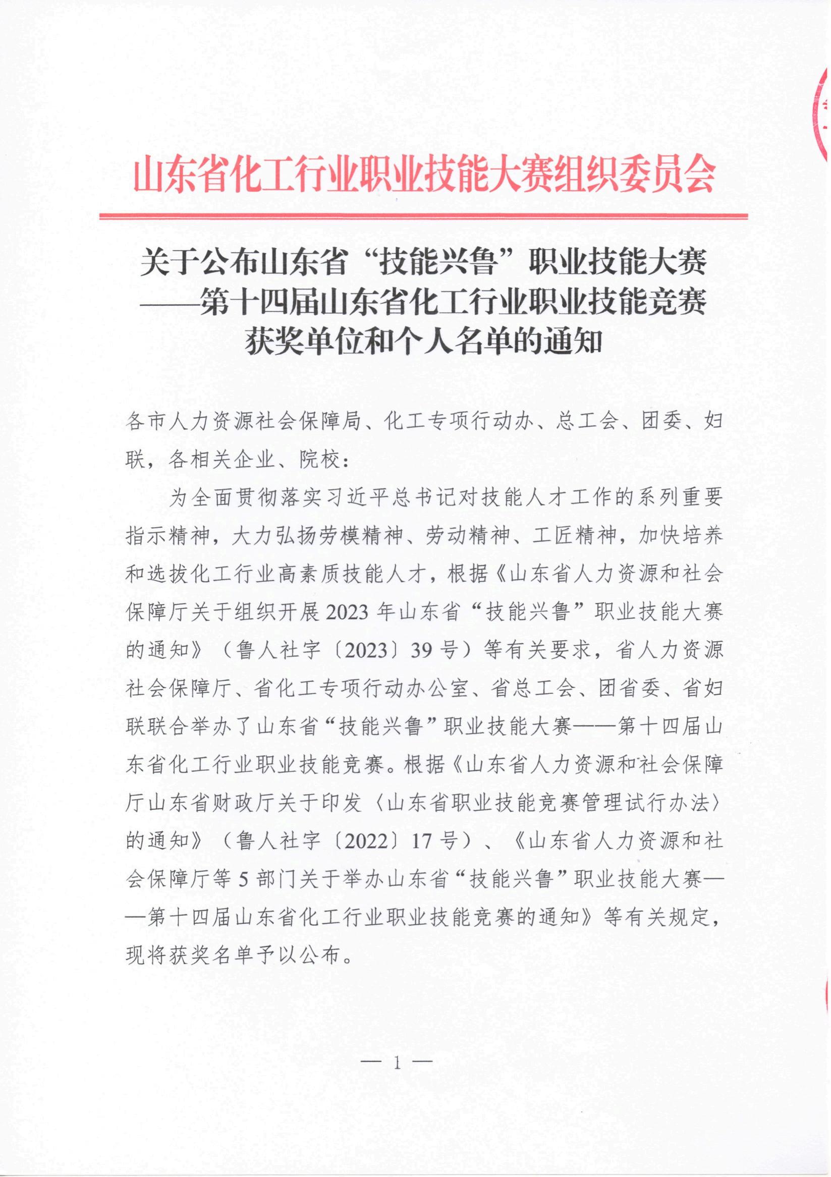 關(guān)于公布山東省“技能興魯”職業(yè)技能大賽——第十四屆山東省化工行業(yè)職業(yè)技能競(jìng)賽獲獎(jiǎng)單位和個(gè)人名單的通知