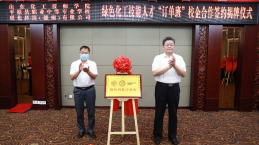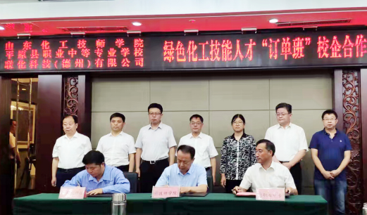 6月1日上午,平原縣委縣政府在平原縣桃源賓館舉行山東化工技師學(xué)院與平原縣職業(yè)中等專業(yè)學(xué)校、聯(lián)化科技(德州)有限公司的校企合作訂單班簽約暨揭牌儀式。德州市人力資源和社會保障局黨組成員、副局長桑青,德州市人才事業(yè)發(fā)展中心主任周春華,平原縣委副書記、縣長盧明鵬,縣委常委、組織部部長楊登雷,縣政府副縣長王俊程,縣教育體育局、縣人力資源社會保障局、縣職業(yè)中等專業(yè)學(xué)校的主要負責同志,聯(lián)化科技、縣重點企業(yè)分管負責人,“訂單班”全體師生以及我院黨委書記孫晉東,招生就業(yè)處處長梁延政、副處長崔波共同參加了簽約儀式。簽約儀式由平原縣副縣長王俊程主持。
