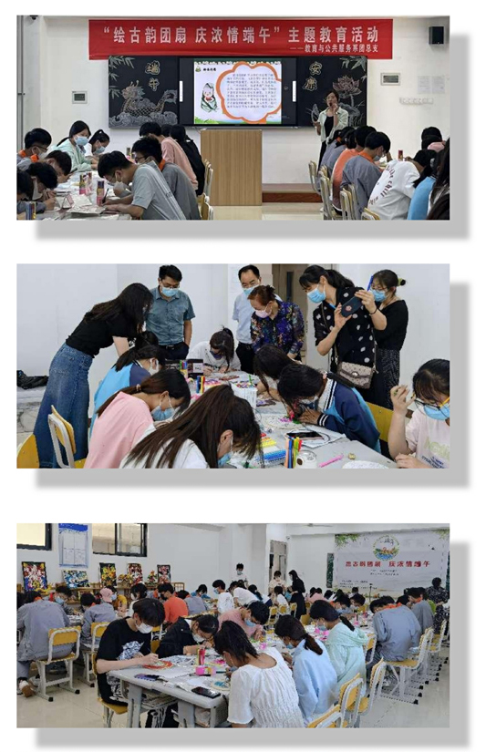 由教育與公共服務(wù)系承辦的“繪古韻團(tuán)扇,慶濃情端午”主題教育活動(dòng)在高鐵新區(qū)校區(qū)如約舉行。“庶動(dòng)清風(fēng),以增美德”,端午贈(zèng)扇相沿成俗。端午節(jié)贈(zèng)扇子體現(xiàn)了儒家仁愛的文化價(jià)值和社會(huì)價(jià)值,倡導(dǎo)學(xué)子崇德向善,更加堅(jiān)定我們的文化自信,F(xiàn)場(chǎng)參與繪團(tuán)扇活動(dòng)的師生超過(guò)百人,居家學(xué)生通過(guò)線上直播的形式與現(xiàn)場(chǎng)積極互動(dòng),感受濃韻的氣氛。活動(dòng)現(xiàn)場(chǎng)由徐曉潔教師進(jìn)行講授,從課程引入,繪畫構(gòu)思,繪畫材料,范作分解四個(gè)方面進(jìn)行講解。學(xué)生們熱情高漲,揮灑畫筆,在潔白的絹布扇面上描繪出一個(gè)個(gè)生動(dòng)形象的畫作,有畫卡通粽子的、有畫龍舟的、有畫荷花的……一把把扇子在大家揮毫之間變得妙趣橫生、搖曳多姿。