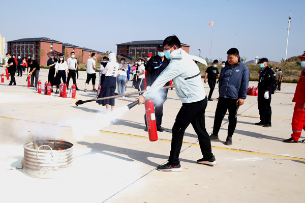 安全管理處負責活動現(xiàn)場安全警戒及具體演練工作,當警報聲準時響起后,同學們按照應(yīng)急預(yù)案中制定的逃生路線迅速、有序逃離火災(zāi)點,到達安全區(qū)域集合。消防安全工程師向師生講解了火災(zāi)預(yù)防和自救知識,介紹了干粉式滅火器和化學實驗室適用的二氧化碳滅火器的使用方法,現(xiàn)場進行了滅火操作演示,并指導(dǎo)師生分組進行了現(xiàn)場滅火體驗。