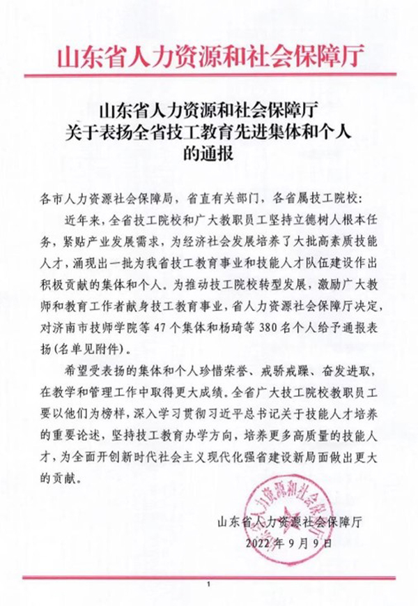 近日,山東省人力資源和社會保障廳下發(fā)《關(guān)于表揚(yáng)全省技工教育先進(jìn)集體和個人的通報》。學(xué)院被表揚(yáng)為全省技工教育“先進(jìn)集體”,4名教師被表揚(yáng)為“先進(jìn)個人”。