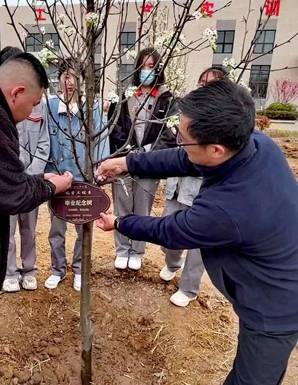 現(xiàn)場,老師和同學(xué)們一起揮鍬鏟土、扶直苗木、回填細壤、夯實土層、提水澆灌……大家飽含感恩之情親手栽下一棵棵彩葉豆梨。并把帶有班級名稱和寄語的樹牌掛在枝頭,用這種獨特的畢業(yè)紀念方式,向美好未來喝彩。