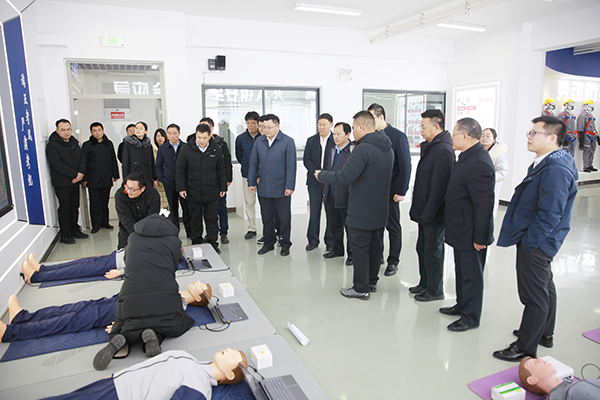 潘東華一行車覽學(xué)院高鐵新區(qū)校區(qū),實(shí)地參觀山東省化工生產(chǎn)安全實(shí)訓(xùn)基地的安全生產(chǎn)警示教育中心、消防及應(yīng)急逃生室、個(gè)體防護(hù)和應(yīng)急救護(hù)室、應(yīng)急指揮及推演室、防災(zāi)減災(zāi)科普體驗(yàn)館、危險(xiǎn)化學(xué)品特種作業(yè)過(guò)程實(shí)訓(xùn)、安全生產(chǎn)隱患排查治理等實(shí)訓(xùn)區(qū)域,詳細(xì)了解實(shí)訓(xùn)基地培訓(xùn)、考核工作開展情況,對(duì)學(xué)院立足化工特色專業(yè)辦學(xué),積極探索政校企深度合作給予充分肯定。