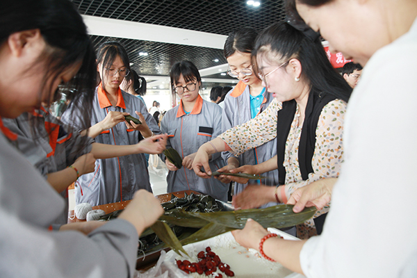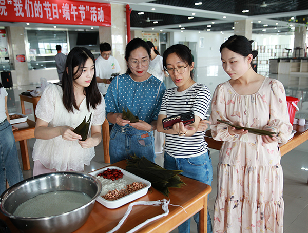 活動(dòng)現(xiàn)場,桌上整齊地?cái)[放著提前泡好的糯米、紅棗、花生、粽葉,老師、學(xué)生一起上手體驗(yàn)了包粽子,大家互相交流、學(xué)習(xí),有的通過觀看視頻學(xué)習(xí)、有的向“老師傅”學(xué)習(xí),先捋粽葉、做成漏斗狀、填糯米、壓緊實(shí)、封口、扎捆,一只只式樣各異的粽子瞬間成型,在互幫互助的包粽子過程中,拉近了距離,增進(jìn)了友情。