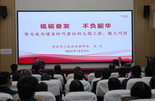 思政課上,左文圍繞“砥礪奮發(fā)、不負韶華——努力成為堪當時代重任的大國工匠、能工巧匠”主題,結合棗莊經濟社會發(fā)展實際,通過擺事實、說道理、提要求、談希望,給學院師生上了一堂別開生面的思政課。