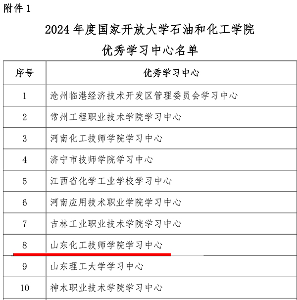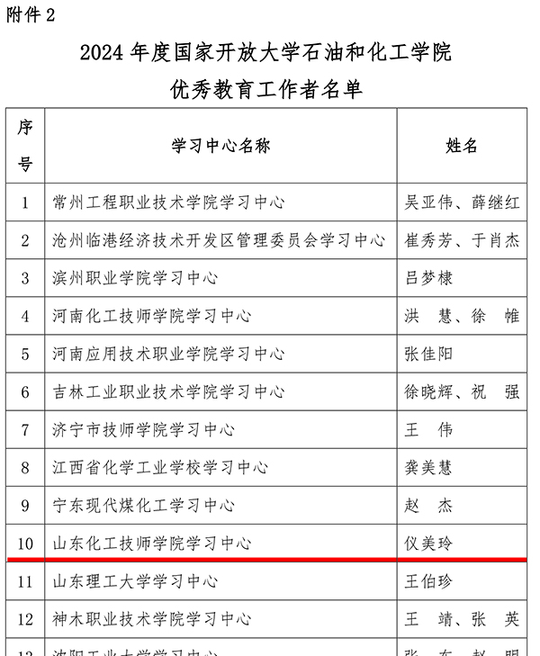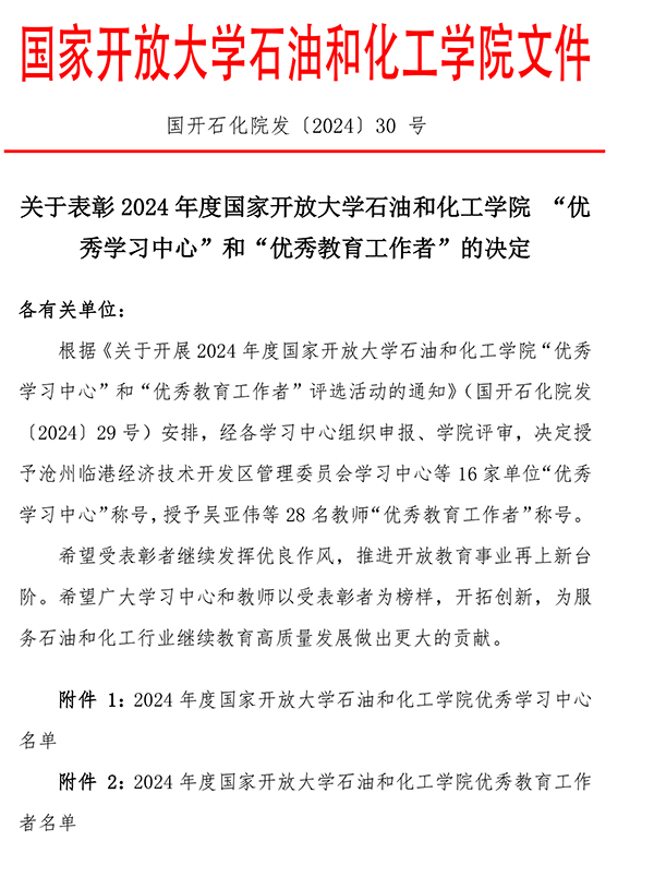 12月24日,國家開放大學石油和化工學院發(fā)布《關于表彰 2024 年度國家開放大學石油和化工學院“優(yōu)秀學習中心”和“優(yōu)秀教育工作者”的決定》(國開石化院發(fā)〔2024〕30號),我院獲評“優(yōu)秀學習中心”,教師儀美玲獲評“優(yōu)秀教育工作者”。