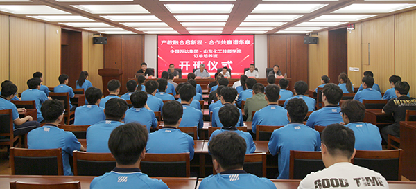 9月9日,中國(guó)萬達(dá)集團(tuán)與山東化工技師學(xué)院訂單培養(yǎng)班開班儀式在高鐵新區(qū)報(bào)告廳舉行,中國(guó)萬達(dá)集團(tuán)山東鴻豐化學(xué)有限公司常務(wù)副總經(jīng)理賈同春、漿態(tài)床工程師丁亞東、人力資源部主任茍建亮、招聘經(jīng)理李效同、招聘主管寧金強(qiáng),學(xué)院副院長(zhǎng)崔世玉、招生就業(yè)處處長(zhǎng)梁延政出席開班儀式,訂單班班主任、全體新學(xué)員參加會(huì)議。招生就業(yè)處處長(zhǎng)梁延政主持開班儀式。