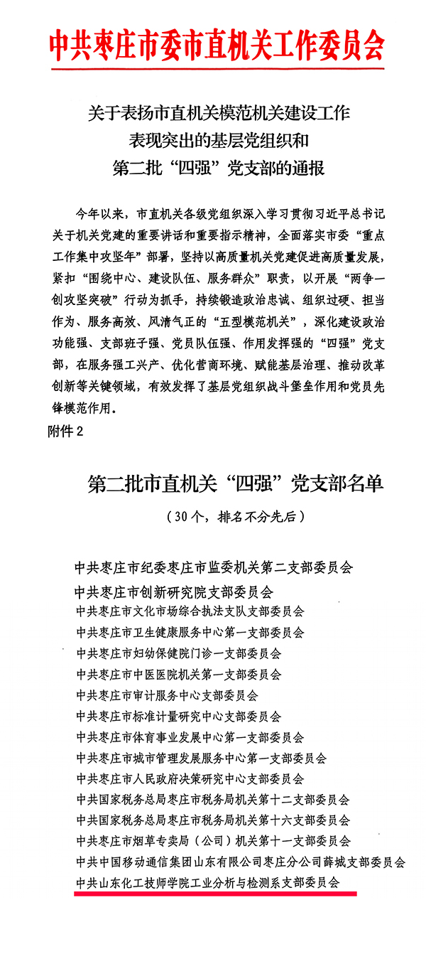近日,棗莊市委市直屬機(jī)關(guān)工委發(fā)布《關(guān)于表揚(yáng)市直機(jī)關(guān)模范機(jī)關(guān)建設(shè)工作表現(xiàn)突出的基層黨組織和第二批“四強(qiáng)”黨支部的通報》,學(xué)院工業(yè)分析與檢測系黨支部獲評“四強(qiáng)”黨支部。