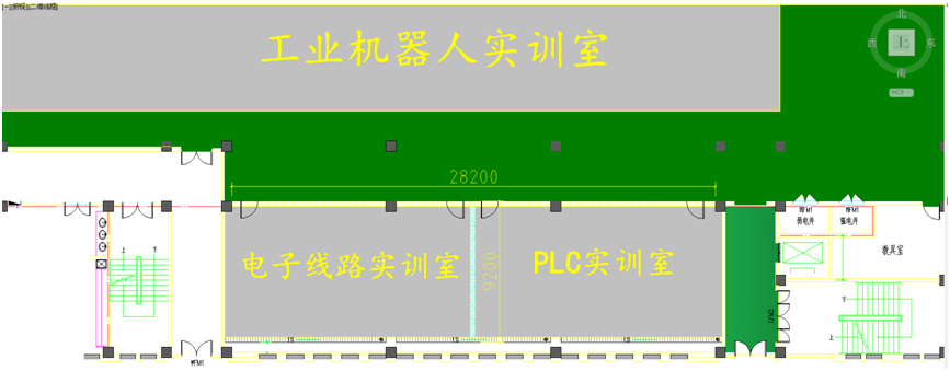 改造區(qū)域基本參數(shù):工業(yè)機(jī)器人實(shí)訓(xùn)室南區(qū)總長(zhǎng)28米,寬9.28米,高3.47米,計(jì)劃從中間分隔為兩個(gè)獨(dú)立實(shí)訓(xùn)室。