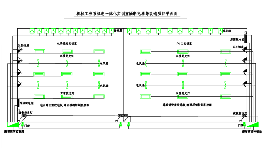 工業(yè)機(jī)器人實(shí)訓(xùn)室南區(qū)多個(gè)班級(jí)同時(shí)上課,存在相互干擾、影響教學(xué)效果的問(wèn)題,且該實(shí)訓(xùn)室常作為學(xué)生晚自習(xí)教室使用。為優(yōu)化教學(xué)環(huán)境,提升教學(xué)質(zhì)量,擬將工業(yè)機(jī)器人實(shí)訓(xùn)室南區(qū)改造為PLC實(shí)訓(xùn)室和電子線路實(shí)訓(xùn)室兩個(gè)獨(dú)立空間。本次改造核心目標(biāo)為實(shí)現(xiàn)兩實(shí)訓(xùn)室物理隔離,滿足各自教學(xué)功能需求,保障教學(xué)安全與環(huán)境舒適度。