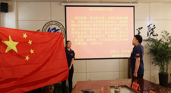 “面向國旗,我鄭重宣誓,我將以飽滿的熱情、昂揚(yáng)的斗志代表國家出征喀山,參加第45屆世界技能大賽化學(xué)實(shí)驗(yàn)室技術(shù)項(xiàng)目的比賽,在世界技能奧林匹克的競(jìng)技賽場(chǎng)上,我將尊重裁判、尊重對(duì)手,賽出風(fēng)格,賽出水平,發(fā)揮出最佳的競(jìng)技水平,積極踐行新青年、新技能、新夢(mèng)想,大力弘揚(yáng)中國工匠精神,勇攀高峰,為國爭(zhēng)光!