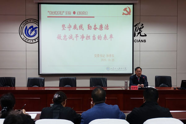 為切實增強黨員干部黨的觀念和黨性意識,根據(jù)學院黨建工作部署,10月28日,學院黨委書記為全體黨員干部講了一堂主題為《堅守底線,勤奮廉潔,做忠誠干凈擔當?shù)谋砺省伏h課。全體黨員、中層及以上干部分別在學院路校區(qū)報告廳主會場和高鐵新區(qū)校區(qū)視頻會議會場參加了學習。