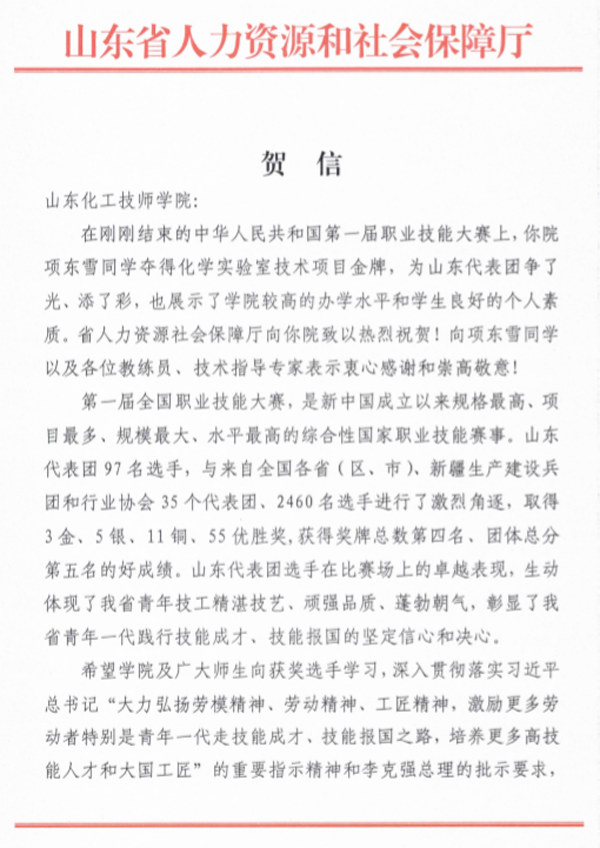 在剛剛結(jié)束的中華人民共和國(guó)第一屆職業(yè)技能大賽上,你院項(xiàng)東雪同學(xué)奪得化學(xué)實(shí)驗(yàn)室技術(shù)項(xiàng)目金牌,為山東代表團(tuán)爭(zhēng)了光、添了彩,也展示了學(xué)院較高的辦學(xué)水平和學(xué)生良好的個(gè)人素質(zhì)。省人力資源社會(huì)保障廳向你院致以熱烈祝賀!向項(xiàng)東雪同學(xué)以及各位教練員、技術(shù)指導(dǎo)專家表示衷心感謝和崇高敬意!